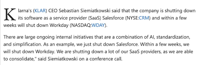 Klarna, a large enterprise fintech announced it was rolling off Salesforce and Workday, two popular and entrenched SaaS companies. That’s likely $50M+ in savings.