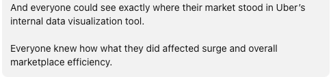 By having a metric like % of trips with surge, Ops and Marketing teams could quickly assess the health of their marketplace.